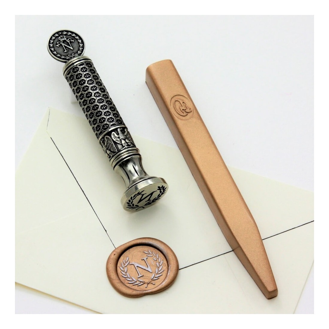 Les Set de timbre de cire Napoléon Scelling (SIG014) est un morceau d'artisanat distingué, fait à la main à Venise par les maîtres artisans à Bortoletti, un atelier familial renommé spécialisé dans les instruments d'écriture et d'étanchéité fins.