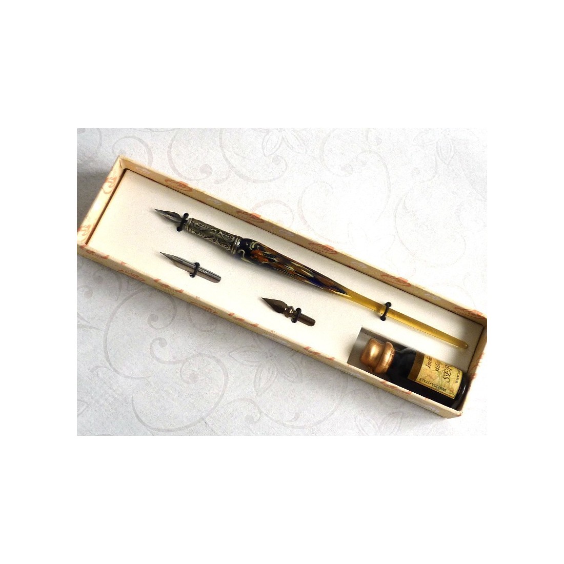 Feuille d'or et stylo en verre. Un ensemble de crayons de plume calligraphie magnifiquement conçu, fini à la main, qui comprend un stylo en verre de Murano avec des flocons de feuille d'or, trois nibs et une bouteille d'encre. Disponible dans une gamme de couleurs merveilleuses. Fabriqué en Italie par Bortoletti Fonderia Artistica.