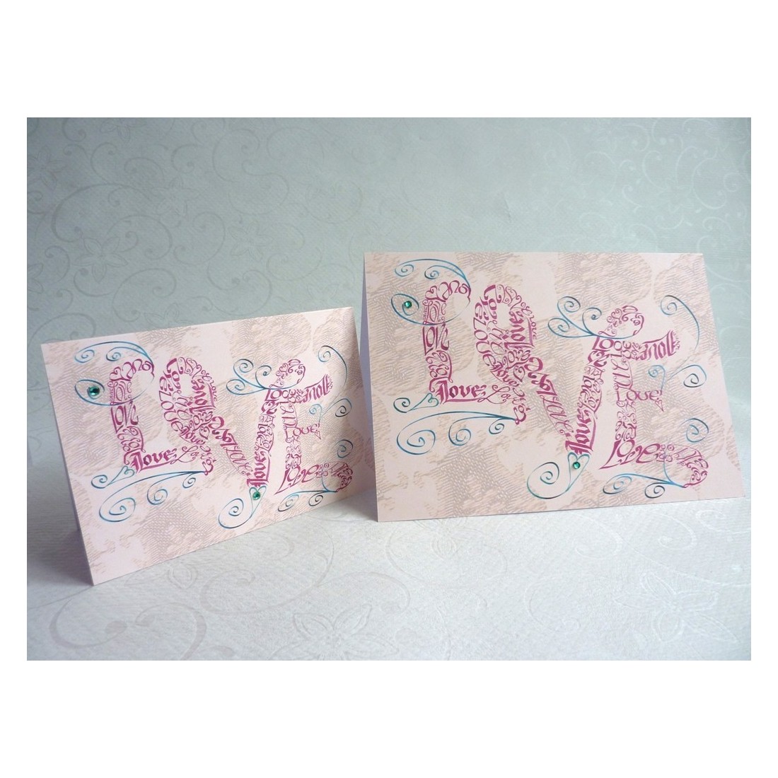 Una versione classica della nostra altra vera carta di calligrafia. Eleganti lettere rosse formano la parola "Love" circondata da vortici, cerchi e diamanti.