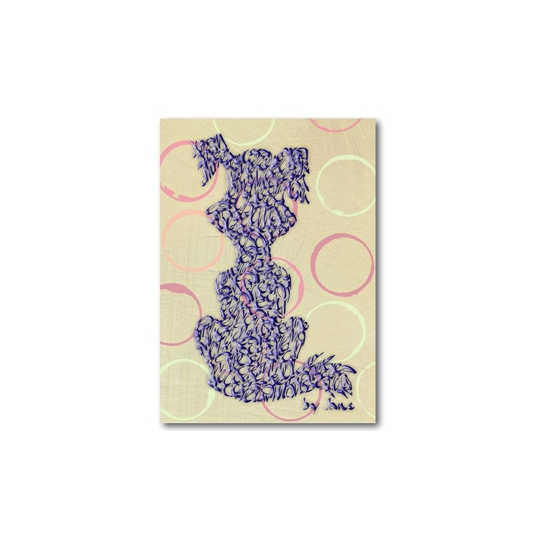 Una carta fatta a mano con un cane viola progettato utilizzando calligrafia in parole, frasi e citazioni tutto su migliore amico dell'uomo. Posizionato su uno sfondo di stile cerchio verde.