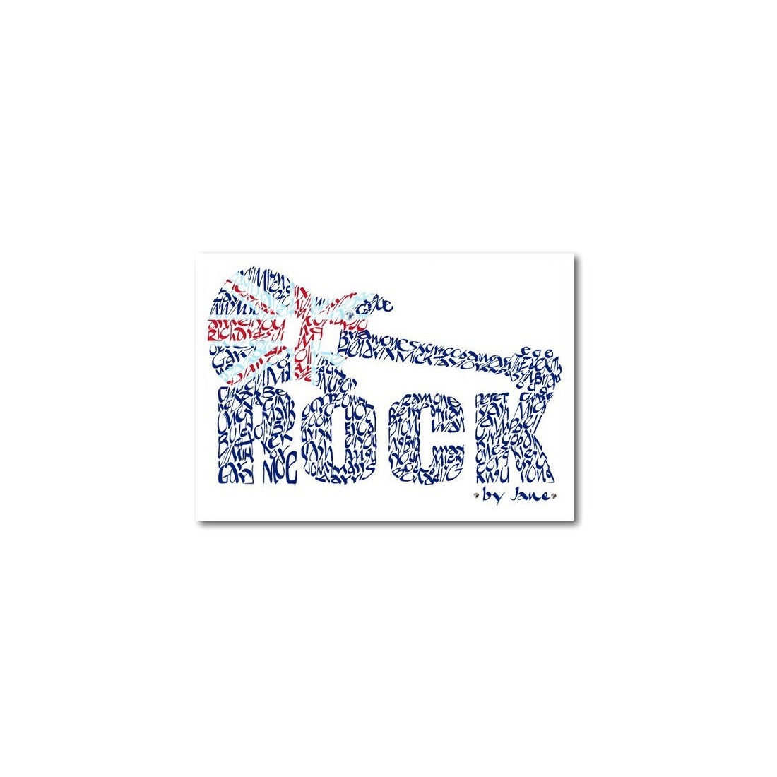 Una chitarra rock ispirata, fatta a mano, carta calligrafica con molti famosi nomi del chitarrista rock nel design. Quanti ne puoi trovare? Union Jack colori nel corpo della chitarra e blu navy testo. Questa splendida scheda fatta a mano ha borchie posizionate entrambi i lati del testo nella parte inferiore della scheda e uno stallone più grande è posto nel corpo della chitarra.