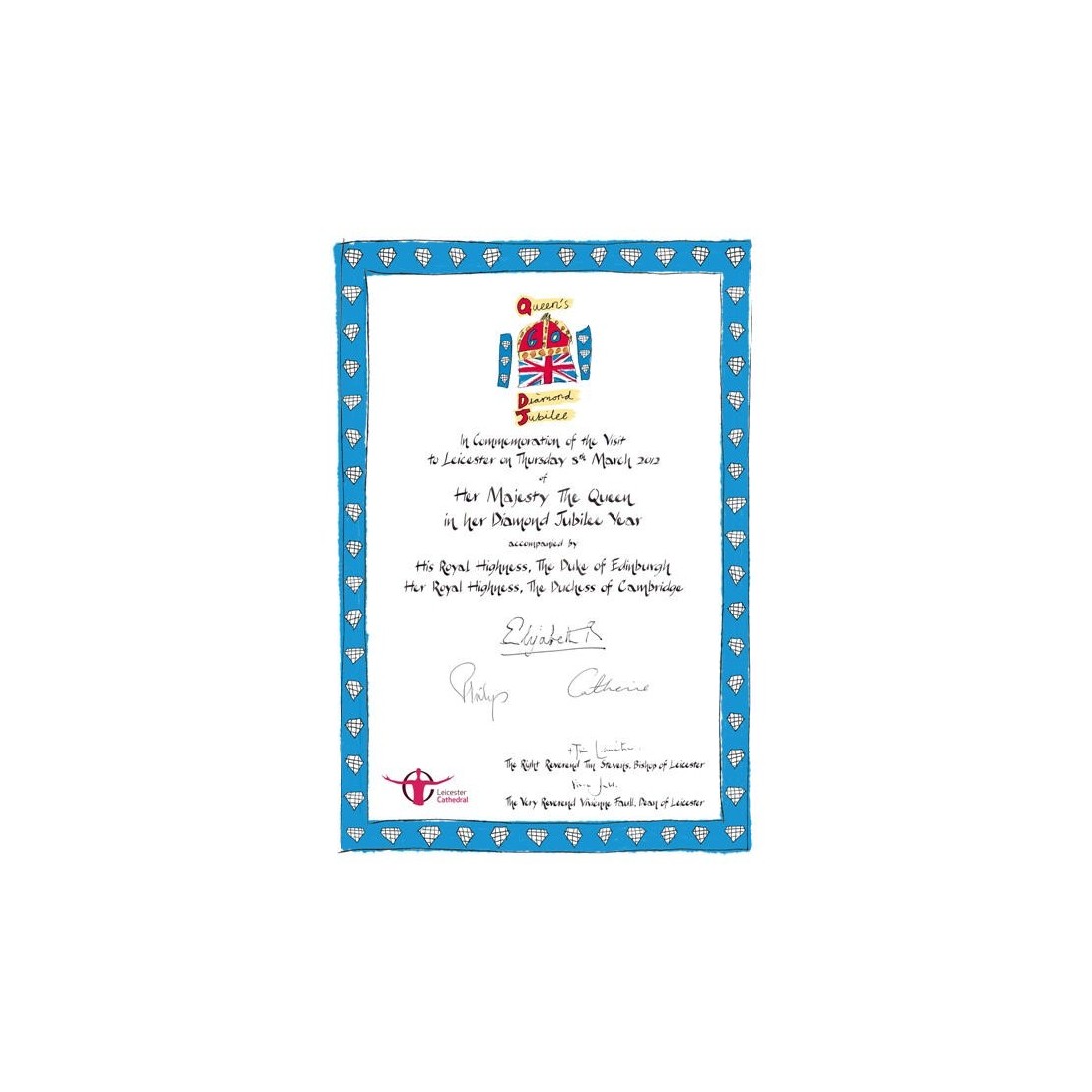 Una rara possibilità di possedere una vera copia del libro ospite reale che è stato firmato dalla Regina durante la sua visita al Giubileo di Diamante nella Cattedrale di Leicester. Disponibile in tre dimensioni. Un grande souvenir.