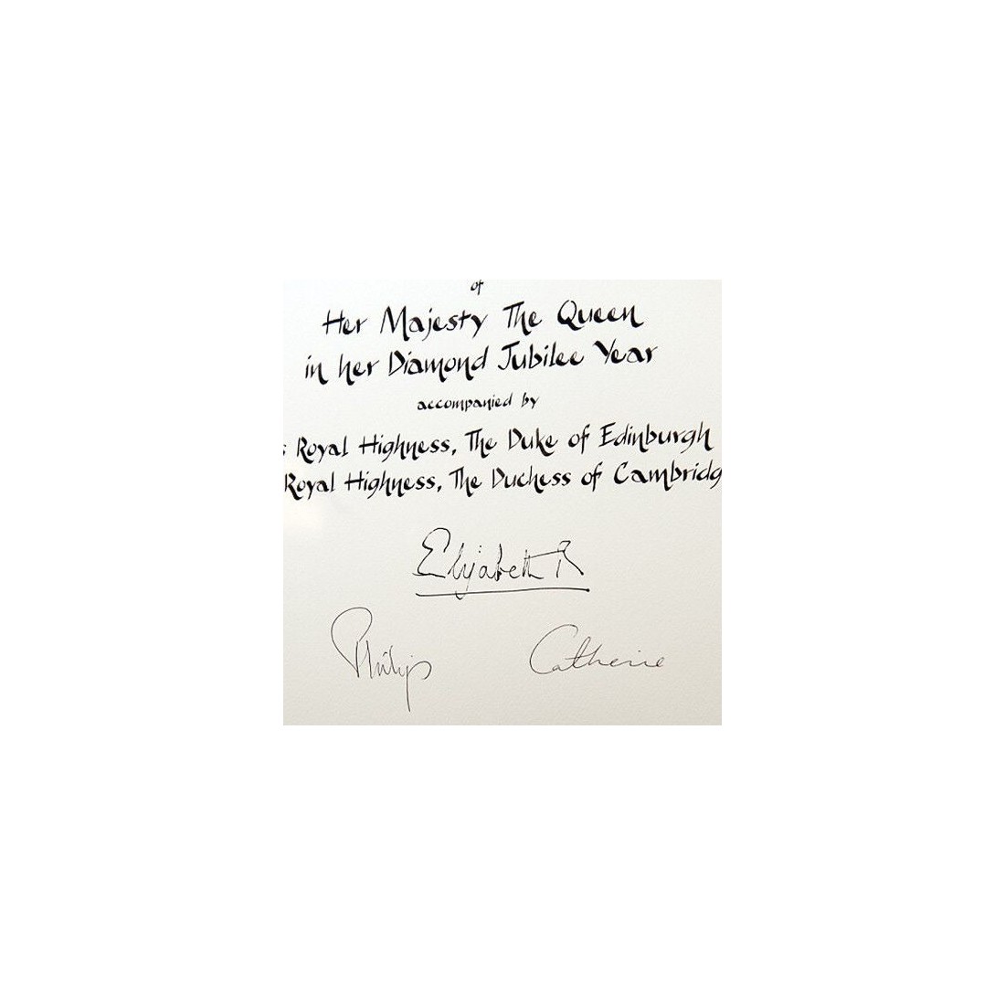 Una rara possibilità di possedere una vera copia del libro degli ospiti reali che è stato firmato dalla Regina durante la sua visita di Diamond Jubilee nella Cattedrale di Leicester l'8 marzo 2012. Questa è la vera opera d'arte progettata da Jane con le copie delle firme reali di The Queen, Prince Philip - Duke of Edinburgh e Catherine - Duchessa di Cambridge. Un meraviglioso souvenir Diamond Jubilee.