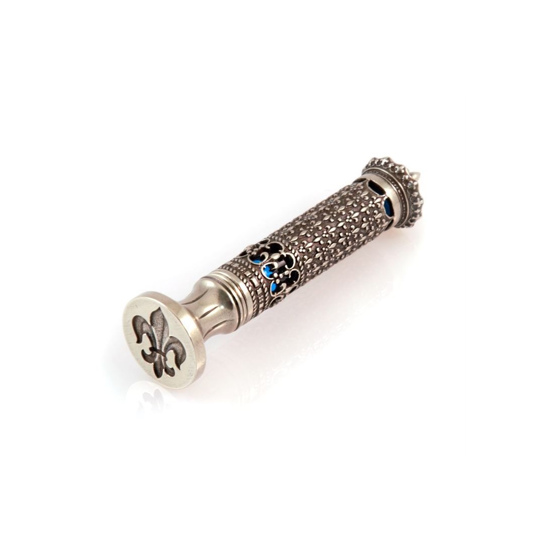 La Corona sigillando il timbro di cera (SIG011) è un vero gioiello di design, realizzato a mano a Venezia dai maestri artigiani a Bortoletti. Creato utilizzando il tradizionale metodo di casting a cera per la cera, il corpo in bronzo è finito con un'elegante placcatura argento nichel e dettagli cesellati a mano, dandola l'aspetto e il raffinamento di gioielli fini.