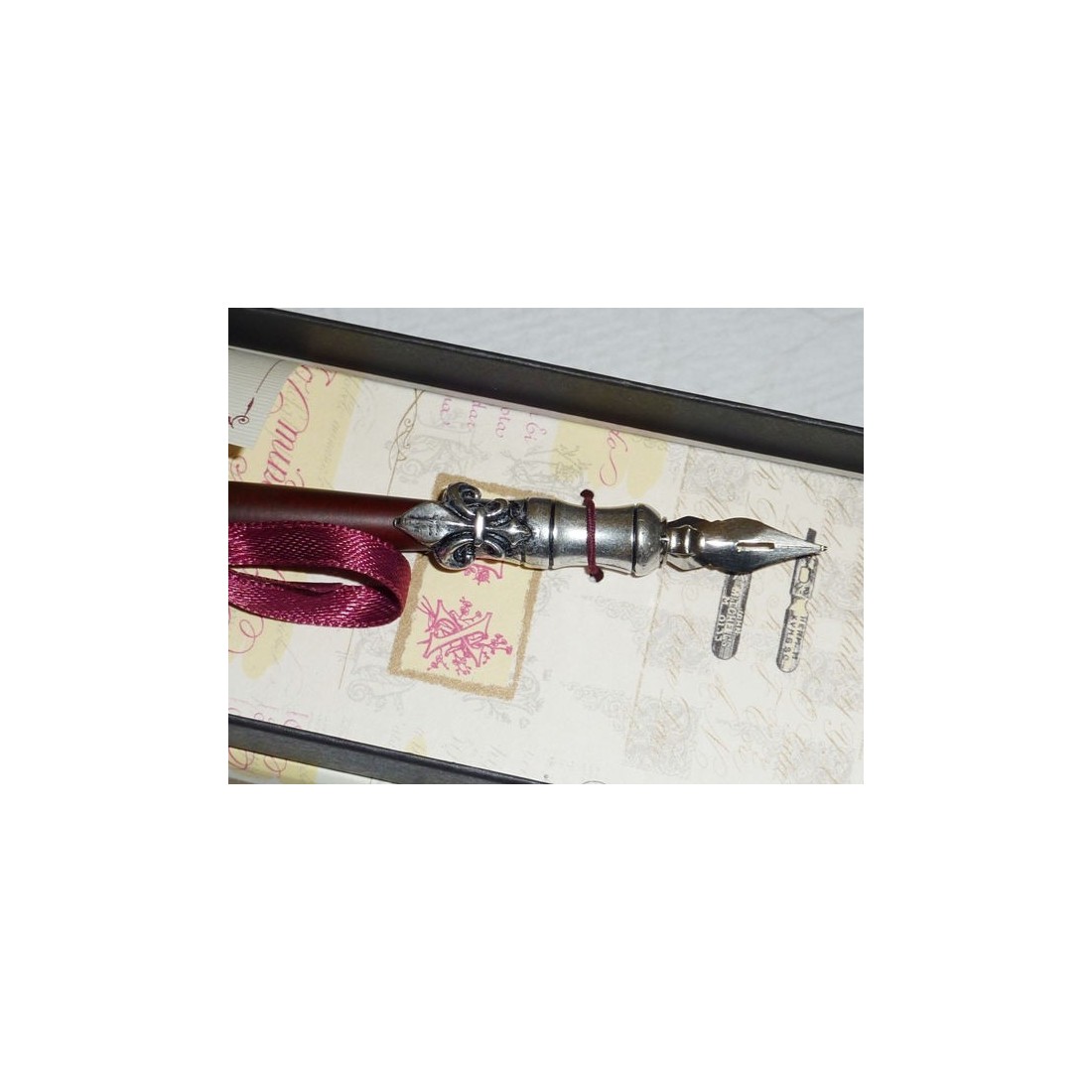 Una penna di calligrafia peltro con un albero di legno. Il portapewter nib ha un design fleur de lys che è molto elegante. Viene completo di una bottiglia di inchiostro nero. I nibs possono essere facilmente cambiati. Made in Italy by La Kaligrafica.