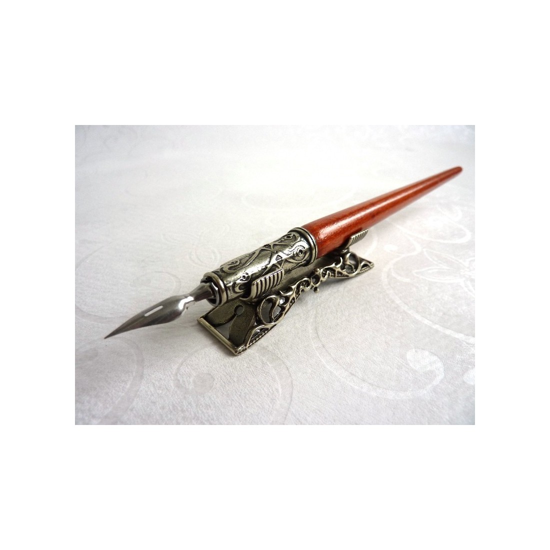 Set di penne in legno con pennino. Ottimo valore e raffinatezza. Set composto da una penna in legno con bronzo e placcato in argento nichel, pennino in argento nichel, bottiglia di inchiostro e tre pennini antichi.