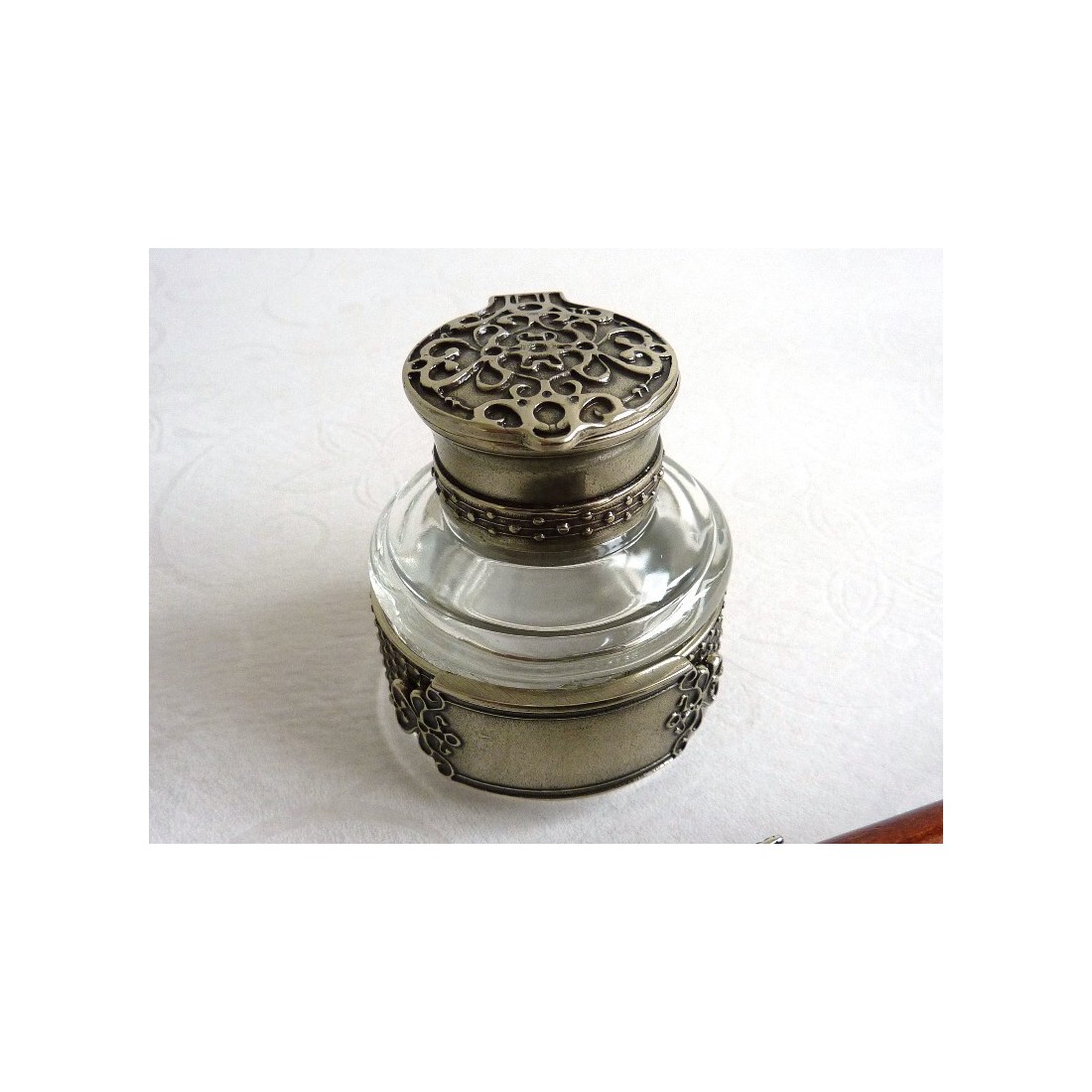 Set di penne in legno con pennino inkwell e ornato. Ottimo valore e raffinatezza. Set composto da una penna in legno con porta nib in bronzo placcato in argento nichel, inkwell e quattro penni antichi. Un set completo per praticare l'arte della bella scrittura. L'inchiostro può anche essere inciso con un nome o un messaggio speciale. Ideale come regalo.