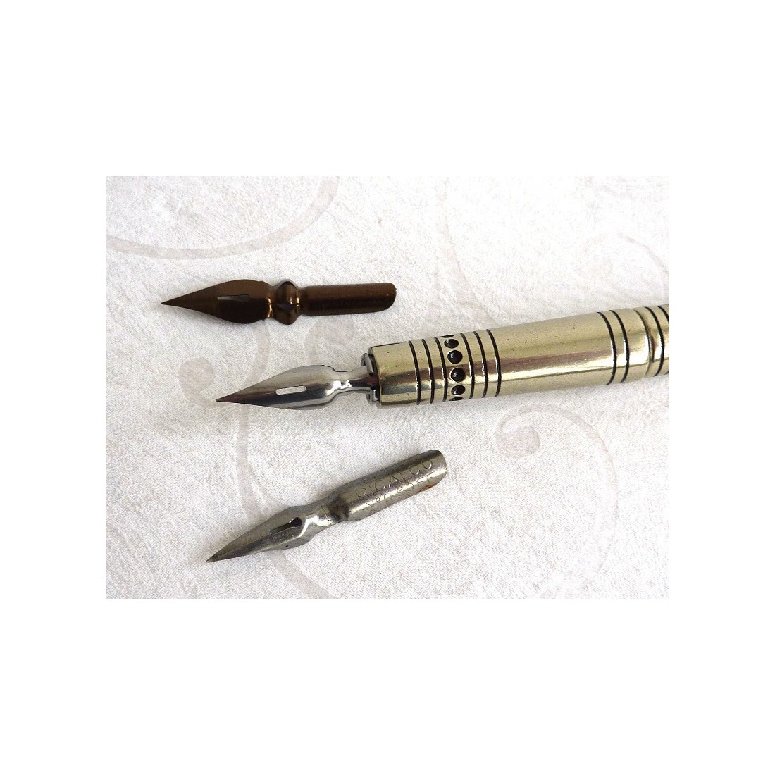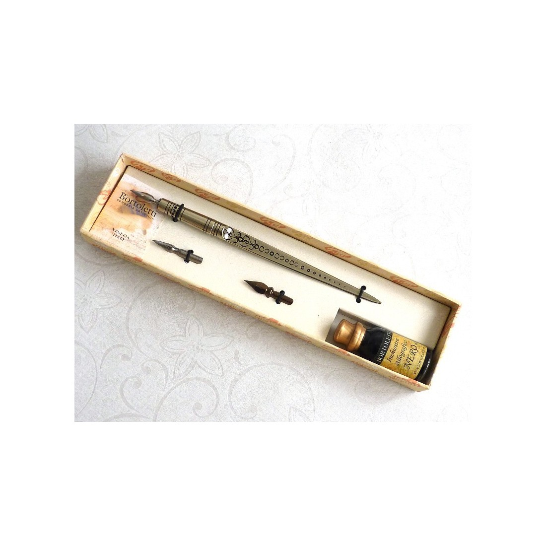 Apri lettere e penna dip in uno. Un ingegnoso set di penne calligrafiche, dove la penna in argento nichel è meravigliosamente decorata, è anche un apri lettere. Include una bottiglia di inchiostro. Prodotto in Italia da Bortoletti Fonderia Artistica.