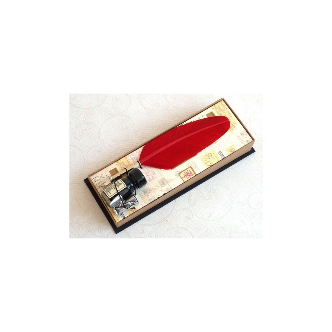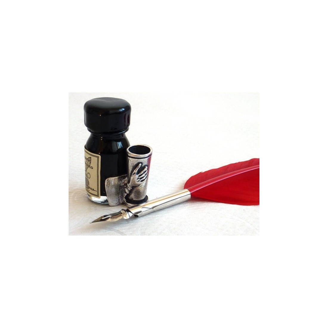Questo meraviglioso set di penna calligrafia e inchiostro in piuma rossa renderà un regalo ideale per coloro che non vogliono le quills di tipo più grande. Viene fornito completo di una bottiglia di inchiostro nero che incorpora un supporto per quill peltro. Made in Italy by La Kaligrafica.