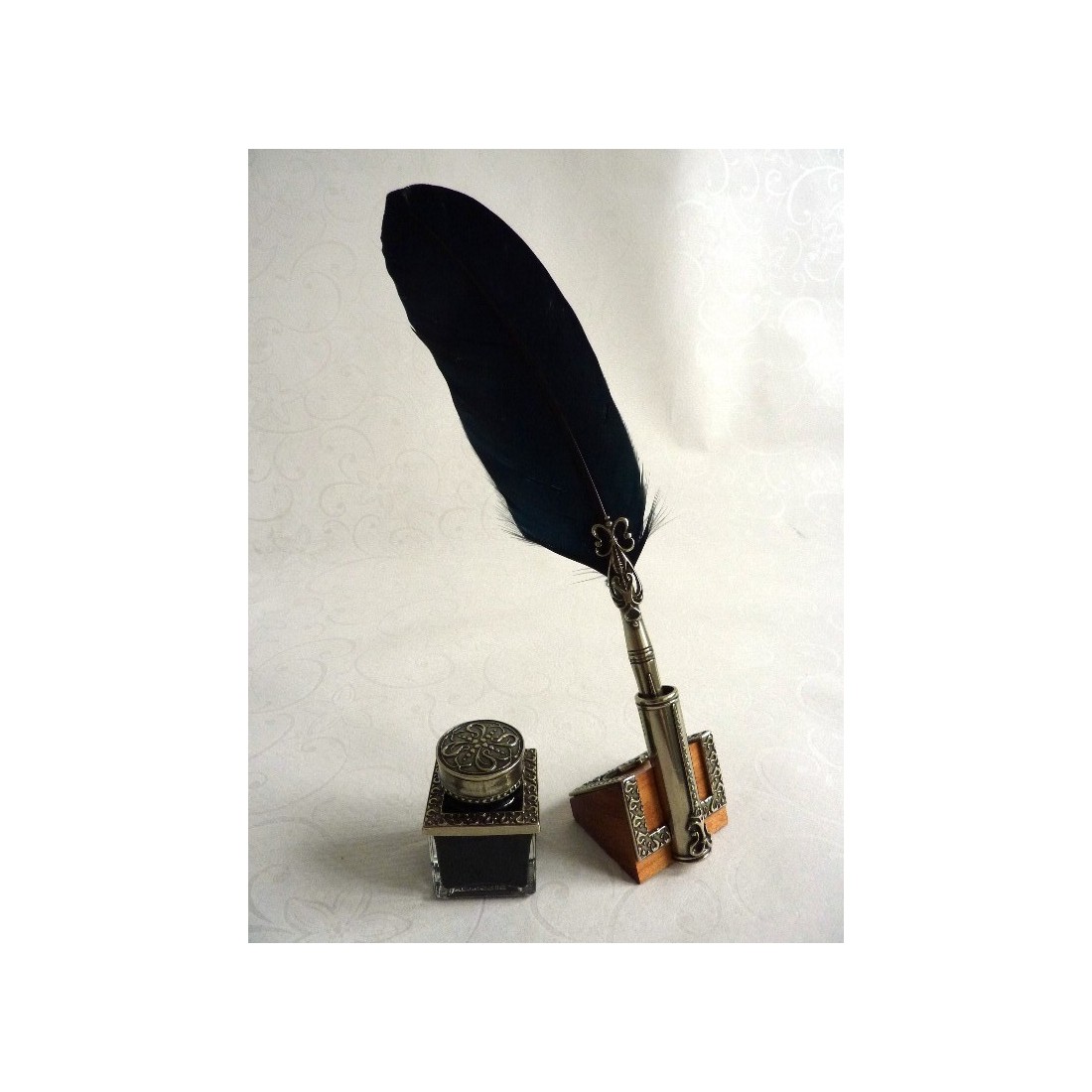 Penna trapunta piuma, inkwell e supporto penna. Questo set comprende una penna calligrafia piuma d'oca con supporto in bronzo nib placcato in argento nichel, inkwell e supporto penna così come una pergamena con la storia di scrittura e un supporto penna. La decorazione nichel-argento arricchisce la penna piuma, inkwell e il supporto penna. Un'idea regalo elegante. Ideale per scrivere i tuoi pensieri in stile.