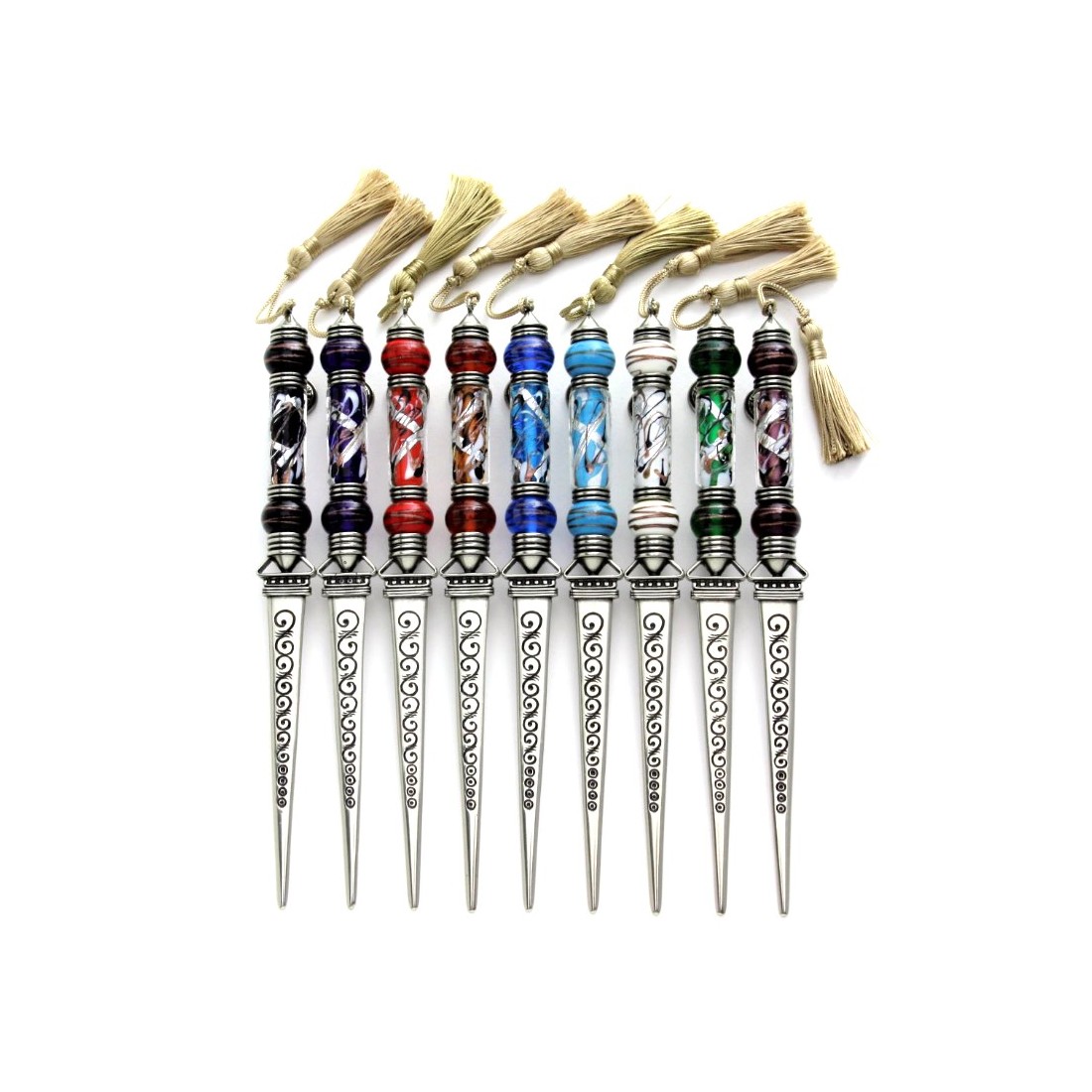 Tagliacarte e lente d'ingrandimento. Oggetti utili ed elementi decorativi che staranno benissimo sulla tua scrivania. Sono realizzati in alpacca con vetro di Murano contenente foglia d'argento. Completo di nappine intrecciate in oro. Il design vecchio stile e la cura di questi articoli parlano da soli.