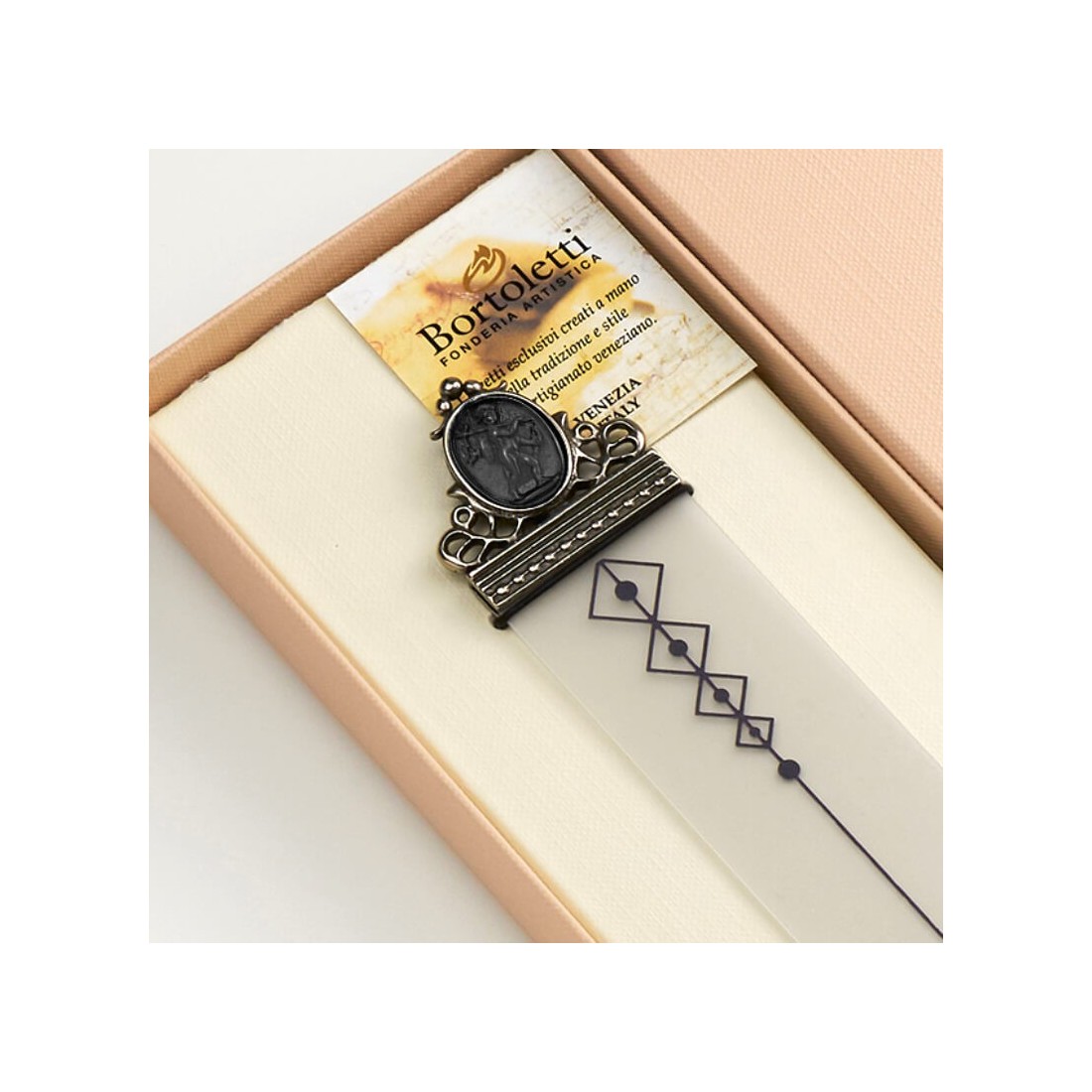 Een handgemaakte boekenlegger voor een stijlvol publiek die het resultaat is van het voortdurende onderzoek van Bortoletti en zijn meester-juweliers op het gebied van design. De verwerking van glaspasta is uniek en wordt doorgegeven door generaties van de meesterglasmakers van Murano.