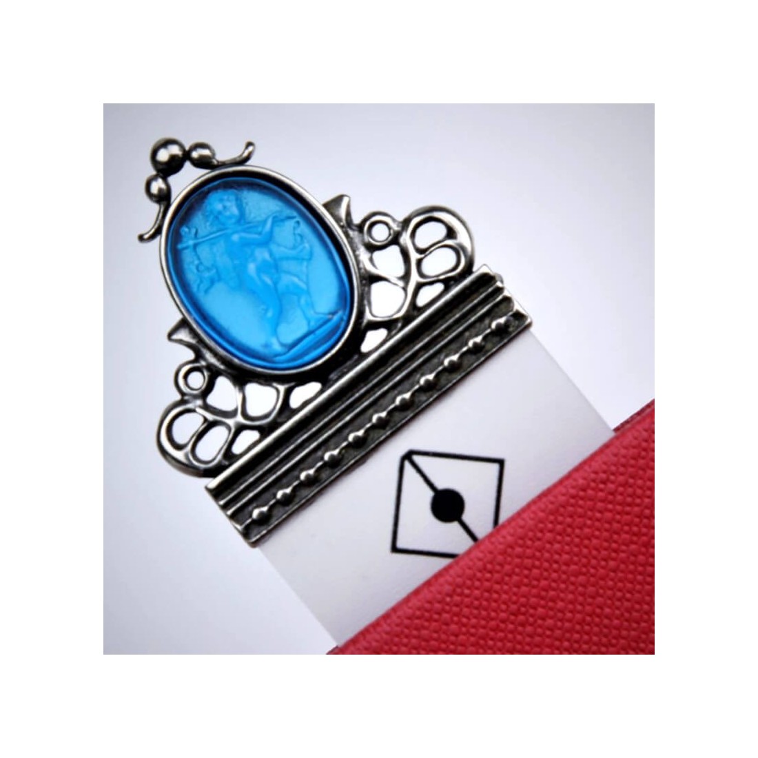 Een elegante boekenlegger verfraaid met een bronzen fries met een camee van glaspasta die een engel met vleugels afbeeldt, ook wel Putto genoemd.