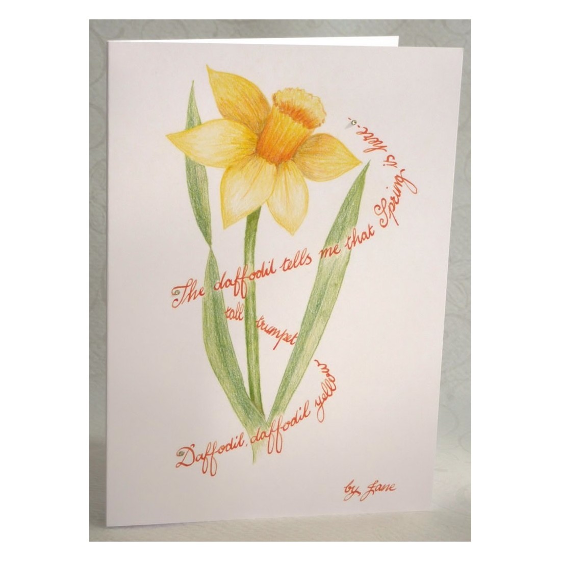 Lente narcis. Kalligrafie wenskaart. Een prachtige narcissenkaart met de hand getekend in potloden door Jane met een seizoensgebonden lentelijm in kalligrafie rond de bloem geschreven.
