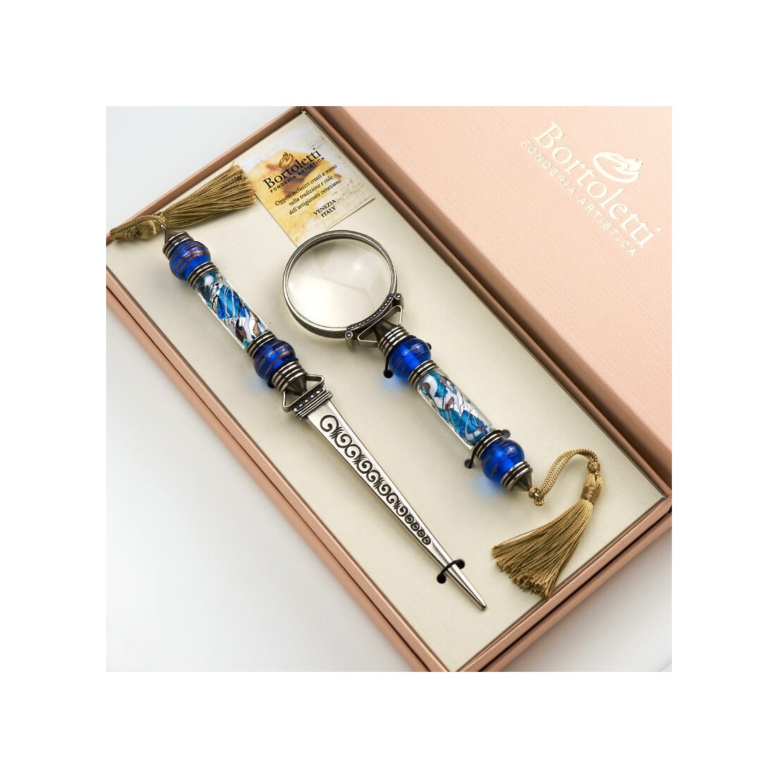 Briefopener en vergrootglas. Handige voorwerpen en decoratieve elementen die geweldig zullen staan op uw bureau. Ze zijn gemaakt van nikkelzilver met Murano-glas met bladzilver. Compleet met goud gevlochten kwastjes. De ouderwetse vormgeving en verzorging van deze items spreken voor zich.