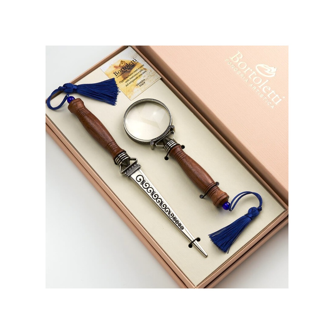 Een complete set van briefopener en vergrootglas gemaakt van natuurlijk hout en wit brons, fijn vervaardigd en met de hand gebeiteld. De eenvoud van hout in een set die een decoratieve aanvulling op je bureau wordt. Een elegant cadeau-idee met eenvoudige stijl. De warmte van hout, de fijn gedecoreerde en met de hand gebeitelde lensring kenmerken het uiterlijk van deze complete bureauaccessoireset, handgemaakt in Venetië. Een typisch ambachtelijk product, nauw verbonden met de plaats waar het vandaan komt en met zijn tradities.