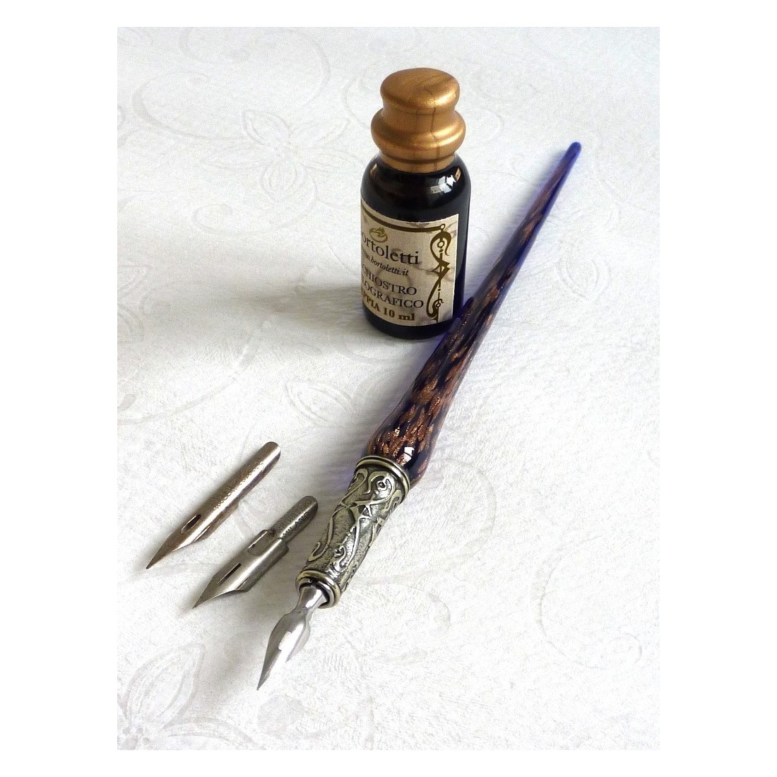 Koperen kristallen en glazen pennenset. Een prachtig vervaardigde, met de hand afgewerkte kalligrafieset met kalligrafiepen, bestaande uit een Murano Aventurijn-kwartsglaspen ingebed met koperkristallen. Ook inbegrepen zijn drie penpunten en een fles inkt. Verkrijgbaar in een reeks prachtige kleuren.
