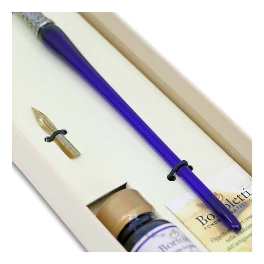Een kalligrafiepen van gewoon glas, gemaakt van Murano-glas en nikkel-verzilverd brons. Compleet met twee extra penpunten en een flesje van 10 ml inkt op waterbasis. Kies uit negen prachtige glaskleuren.