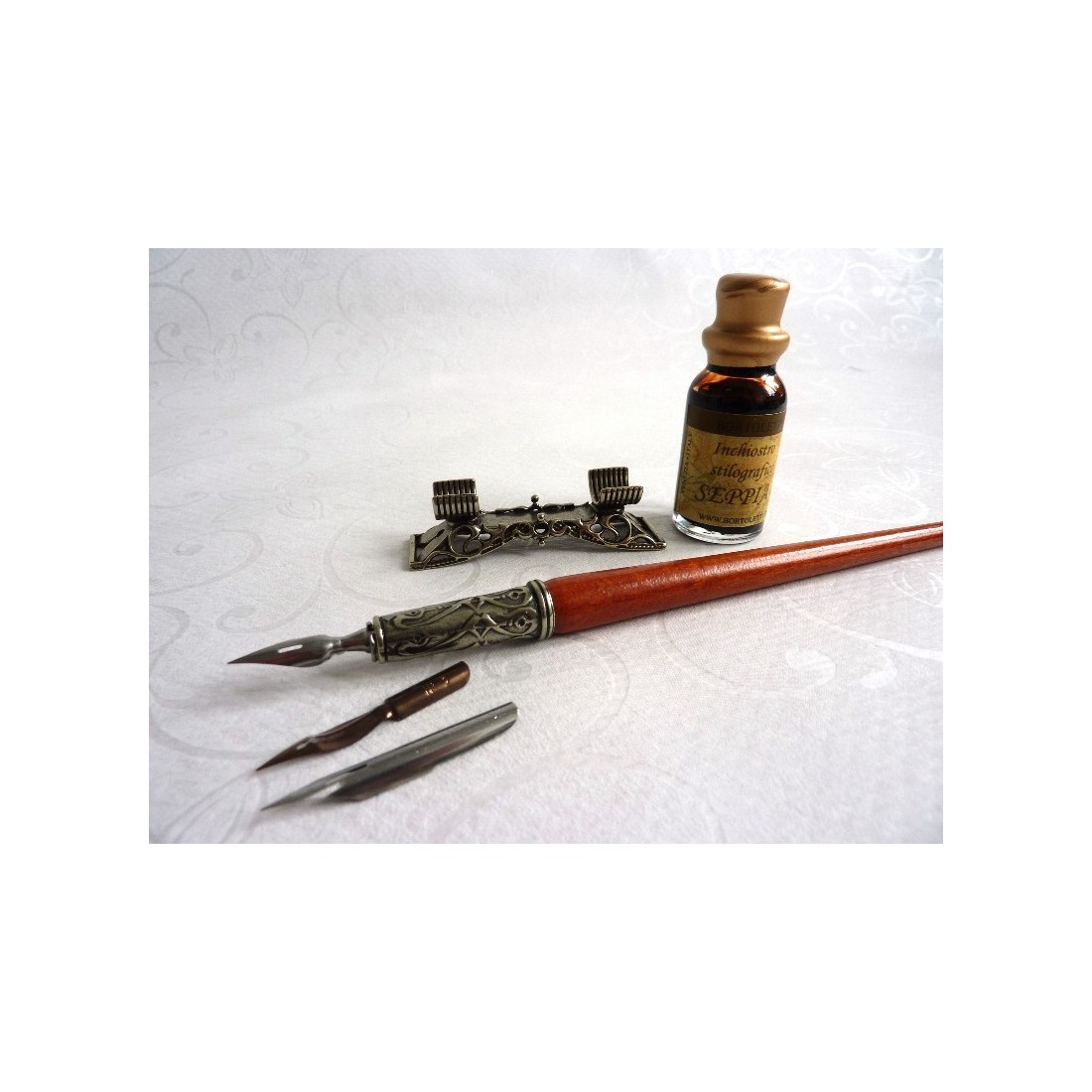 Houten pennenset met pen rust. Grote waarde en raffinement. Set bestaat uit een houten pen met brons en verguld in nikkel zilver, pen rust in nikkel zilver, fles inkt en drie antieke penpunten. Vervaardigd in Italië door Bortoletti Fonderia Artistica.