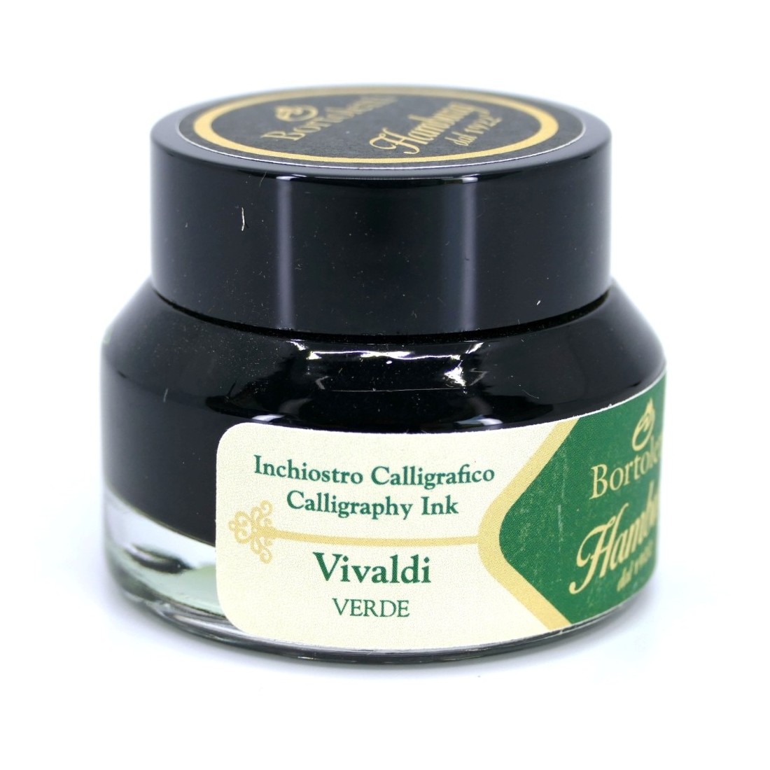 Een fles groene Italiaanse kalligrafie-inkt van goede kwaliteit (30 ml). Geleverd door Bortoletti. Vivaldi is een inkt die de energie van Briljant Groen draagt; een hommage aan de kracht van de natuur die de Italiaanse componist het beste kon vieren in zijn “Vier Jaargetijden”.