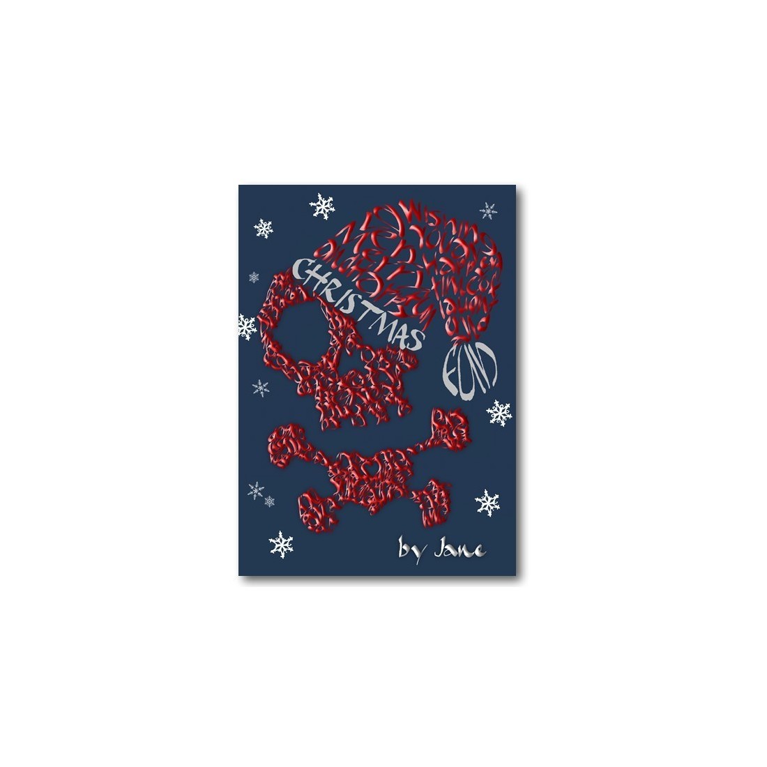 Ontworpen met behulp van kalligrafie in woorden, zinnen en citaten, alles over piraten en dergelijke. Laat me rillen, hout. A'harr !! Deze prachtige handgemaakte kerstkaart heeft zilveren glitters in de hoed en diamanten in de vele sneeuwvlokken op de kaart en een rode diamant in het midden van de gekruiste botten van de schedel.