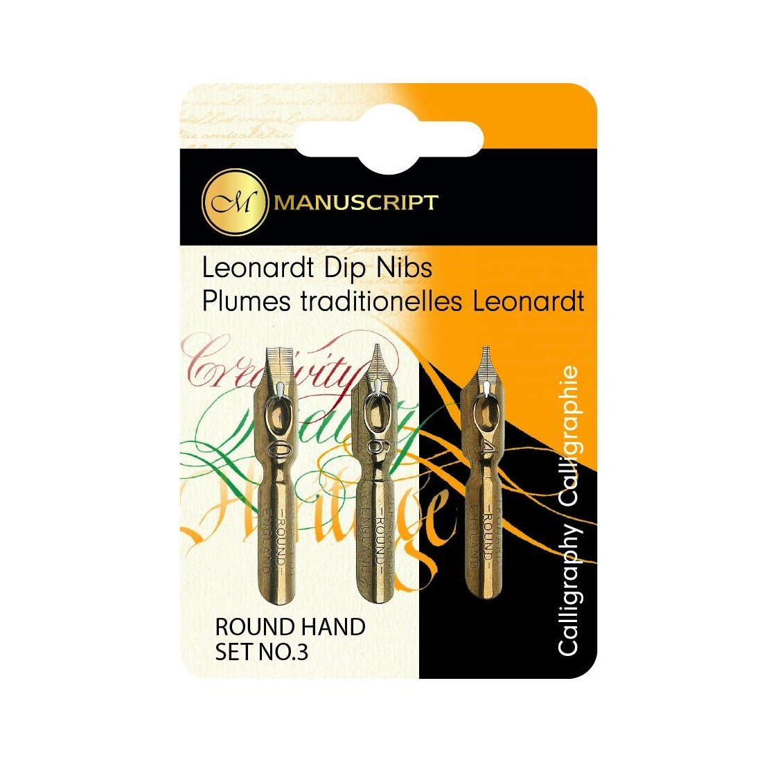 Een set van drie Rondschrift penpunten. Maten 0, 4, 6 - met inbegrip van reservoirs. Vervaardigd door Manuscript in Groot-Brittannië.