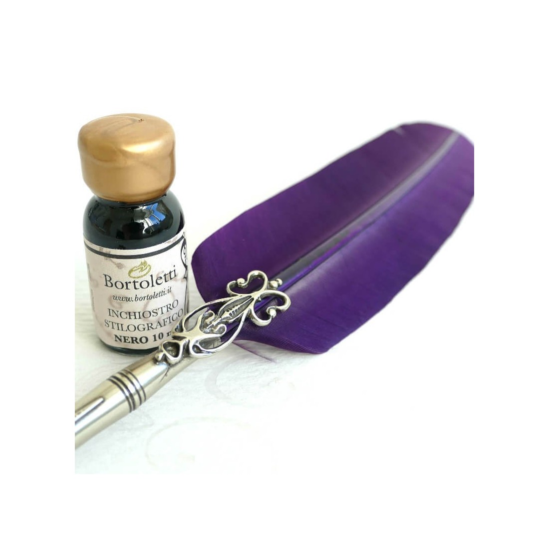 Een veer kalligrafie pen, twee tips en inkt. Deze set bestaat uit een gans kalligrafie pen met brons penpunt houder verguld in nikkel zilver, een standaard fles inkt en twee antieke tips. Vervaardigd in Italië door Bortoletti Fonderia Artistica.