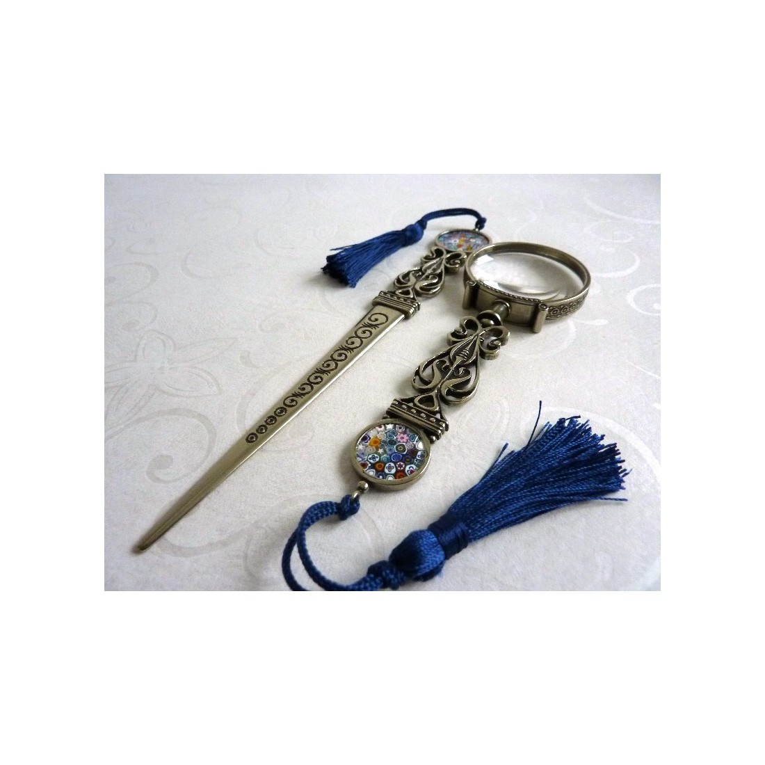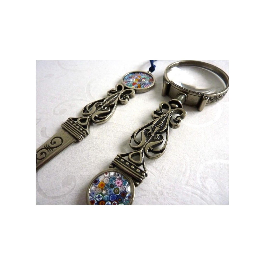 Brevöppnare och förstoringsglas, användbara föremål och dekorativa element kommer att se fantastisk på ditt skrivbord. De är gjorda av nickle silver med mycket färgglada Murrina glaspärlor. För de människor som älskar stil med venetianska elegans.