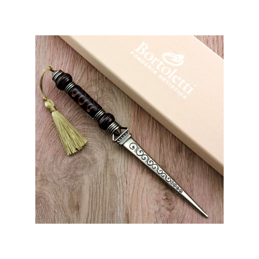 Brevöppnare TAG04 Bellucci. Handgjorda med blommiga pärlor för en viktig present. En brevöppnare med tre Murano glaspärlor dekorerade med strängar av aventurin smält till färgat glas. Aventurin är en blandning av glas och kopparkristaller som ger en glänsande, metallisk effekt till dekorationerna, en unik process som uppfanns på 1600-talet i Murano och som utmärker pärlorna i denna vackra uppsättning.
