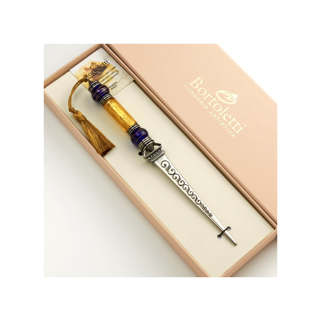 Denna brevöppnare har dyrbart bladguld smält i Murano-glas för den mest eleganta presenten. Exklusiv brevöppnare i brons och Muranoglas, ett unikt föremål med en pärla täckt med 24-karats bladguld, tillverkad av Bortolettis mästare i glasmakare i deras verkstad.