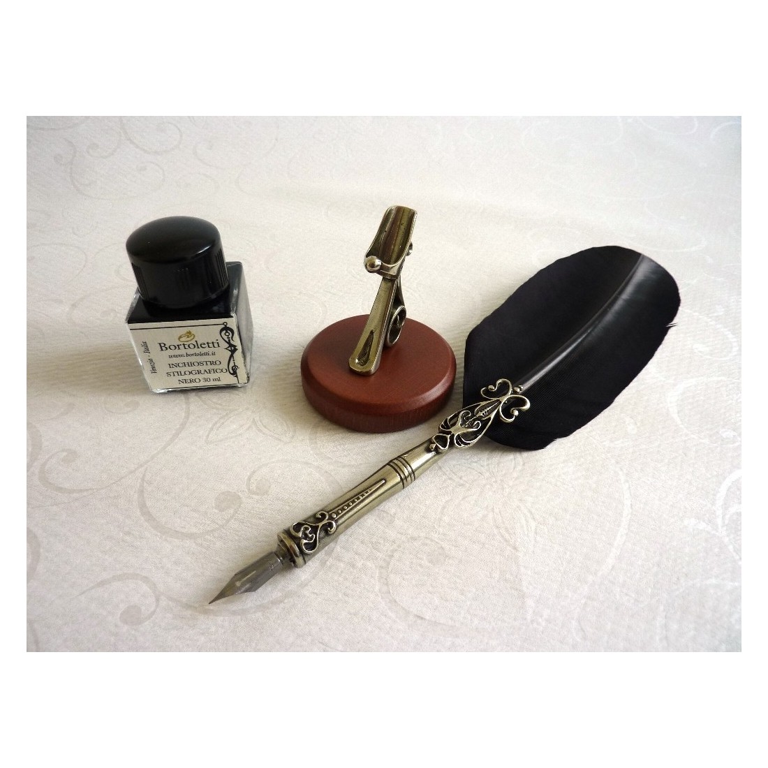 Fjäderkalligrafi penna, fem nibs och en pennahållare. Denna uppsättning består av en gåsfjäderkalligrafi penna med brons nibhållare pläterad i nickel silver, en stor flaska bläck, diskantskiva pennhållare och fem antika nibs. Tillverkad i Italien av Bortoletti Fonderia artistica.