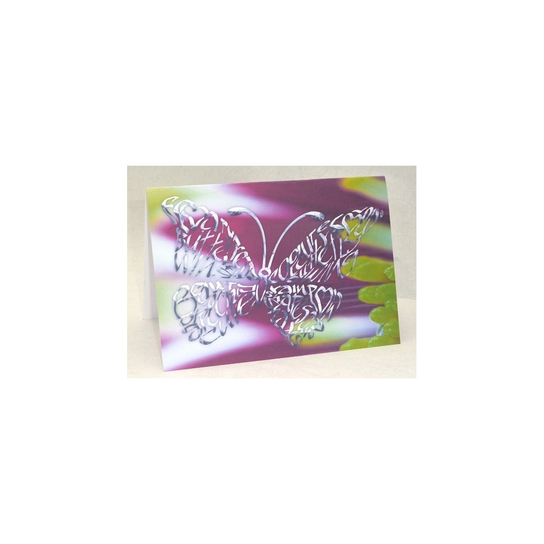 En vacker krom effekt fjärilen utformad i ord närmar sig en lila blomma. Denna underbara fjäril design speglar den delikat skönheten av våra bevingade sommarträdgård vänner. Unikt, original och väldigt annorlunda från våra vanliga gratulationskort.
