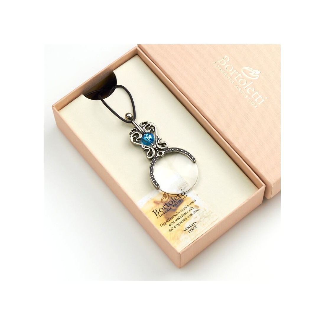Detta smycke är väl lämpat för en originalpresent. Tillverkad av vit brons med applicering av en Murano glaspärla med silver eller bladguld smält in i glaset. Ranieri-halsförstoringsglaset är en originaldesign av Bortoletti.