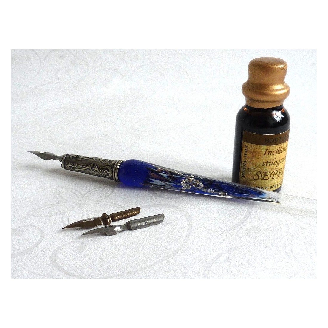 En vackert utformad, handen klar kalligrafi dopp penna set, som omfattar en Muranoglas penna med silverbladflingor, tre spetsar och en flaska bläck. Finns i en rad härliga färger.
