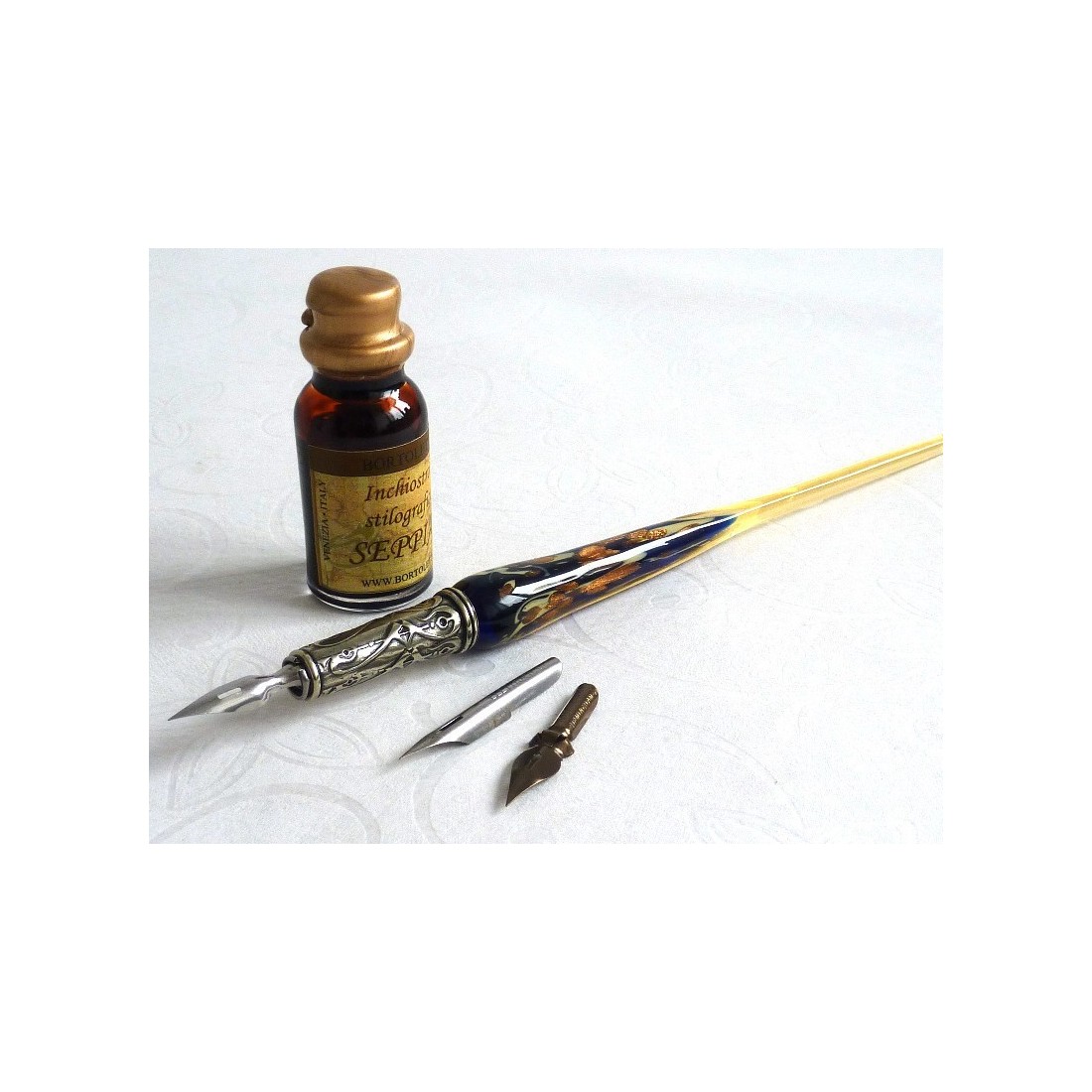 En vackert utformad, handen klar kalligrafi dopp penna set, som omfattar en Muranoglas penna med bladguld flingor, tre spetsar och en flaska bläck. Finns i en rad härliga färger.