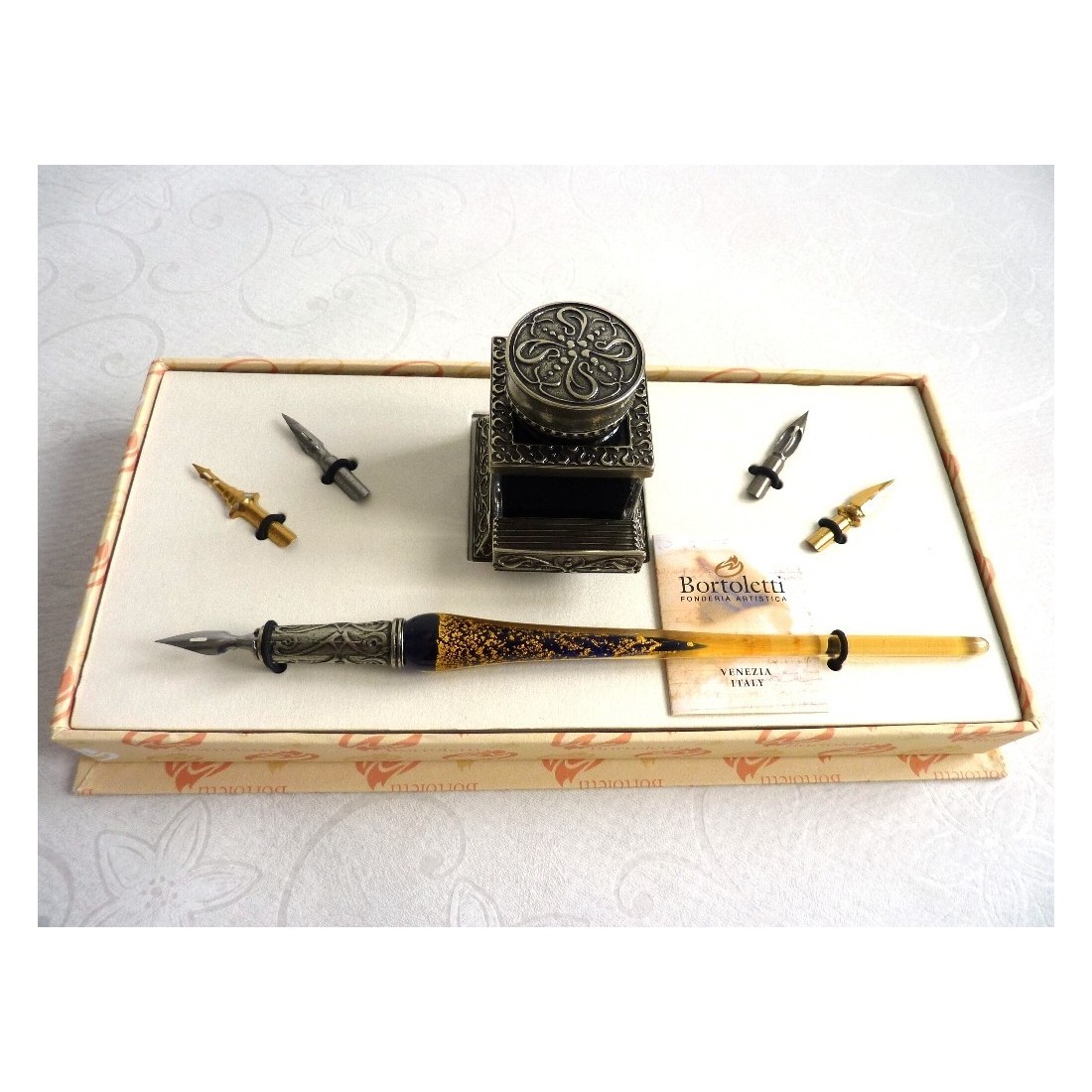 Murano glas och guld blad penna set. En vackert utformad, hand klar kalligrafi doppa pennan set. Innefattar ett glas & nickle försilvrad brons dip penna, fyra spetsar och en utsmyckad bläckhorn . Finns i olika färger. Tillverkad i Italien av Bortoletti Fonderia Artistica.
