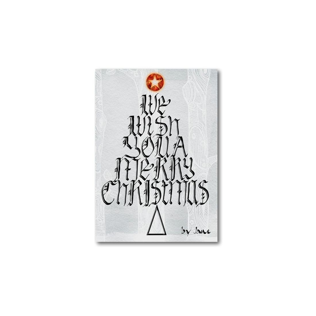 Vi önskar er en god jul. En härlig kalligrafiska kort som har dessa ord plockas ut i en gotisk stil för att bilda en julgran placeras i en vinter skogsmark. Toppade med en klarröd lysande stjärna.