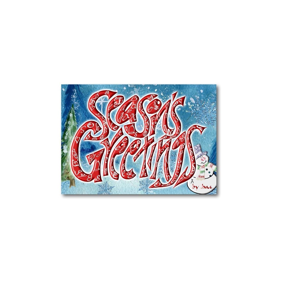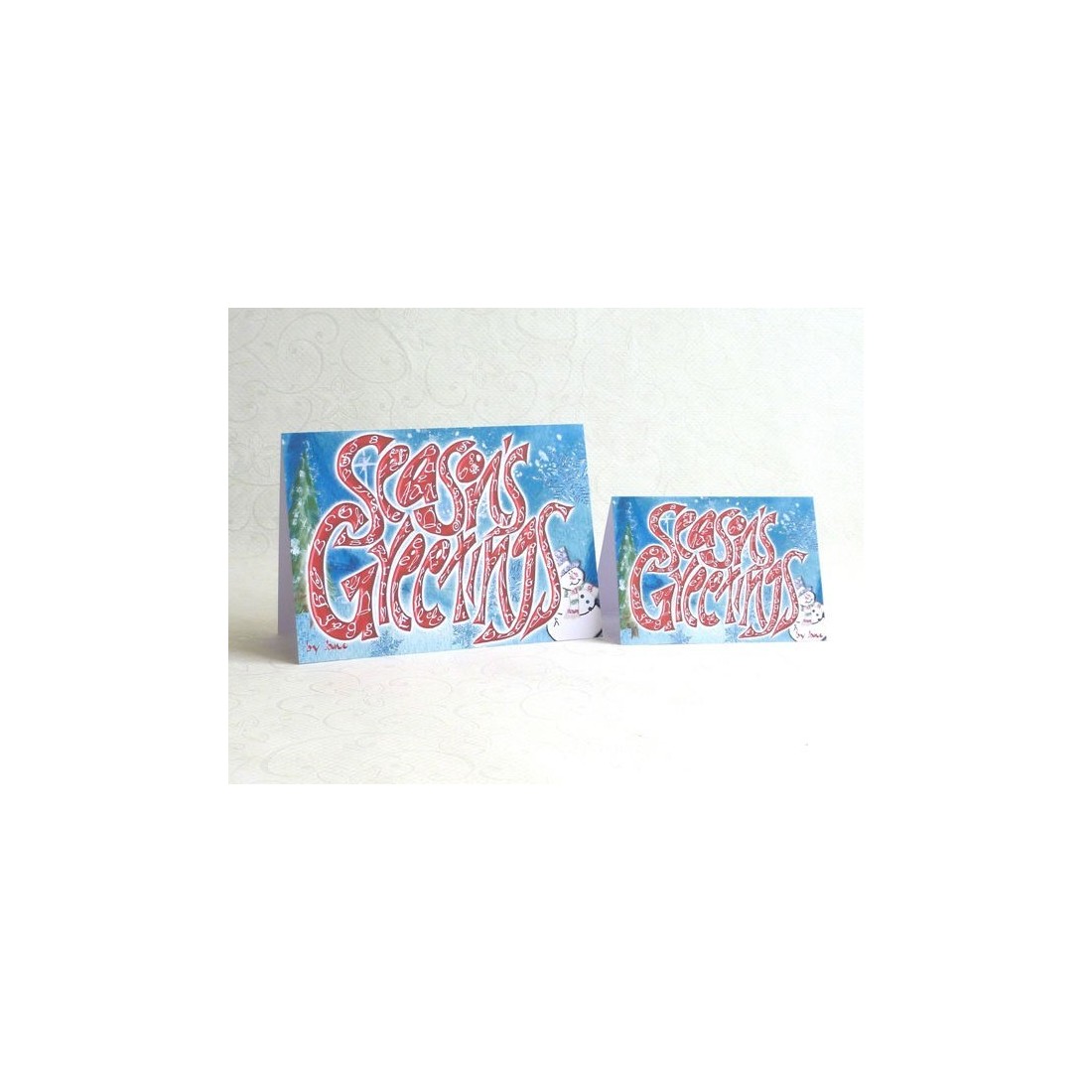 Säsonger Hälsningar till alla! Skicka en liten jubel under semesterperioden. Röd bokstäver markerade med kalligrafiska bokstäver och symboler. Allt i ett vinterlandskap inställning.