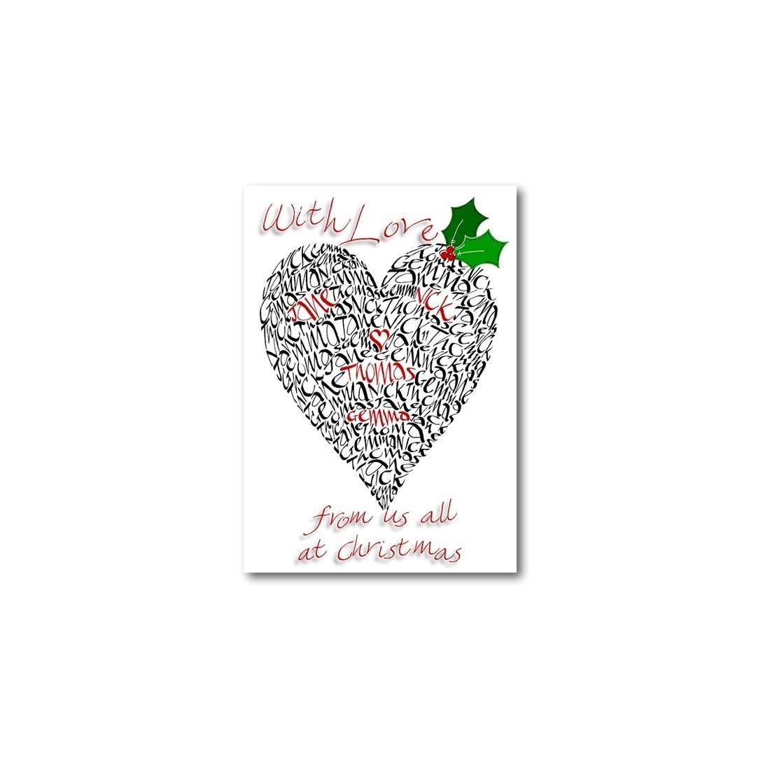En fantastisk möjlighet att få förpackningar med bedövning, skräddarsydda hjärta utformade julkort skapat speciellt för dig. Liksom vår design, "The Heart of min familj", dessa underbara kort har alla dina efternamn skrivna hela i Janes egna kalligrafiska stil. Var och en av din familj medlemmens namn är hand manus skapar hjärt form design med en av varje av de namn markeras med rött medan resten av designen är skript i svart. Vid centrum av hjärtat på dessa ursnygga kort är en röd diamante. Som innan du kan vara säker på detta konstverk kommer att vara unik för din familj.