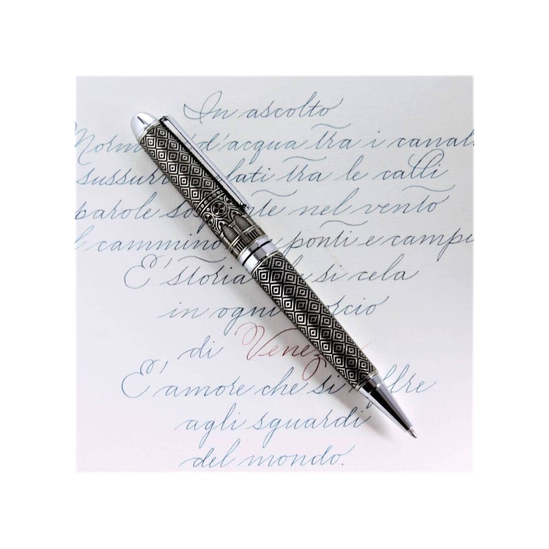 Kulspetspenna PENS03 Ducale kulspetspenna i brons, för att hedra dogerna och det fantastiska venetianska palatset. Dogepalatset, byggt i gotisk stil, har utsikt över Markusbassängen. Det kallades tidigare Dogepalatset eftersom det var säte för Dogen.