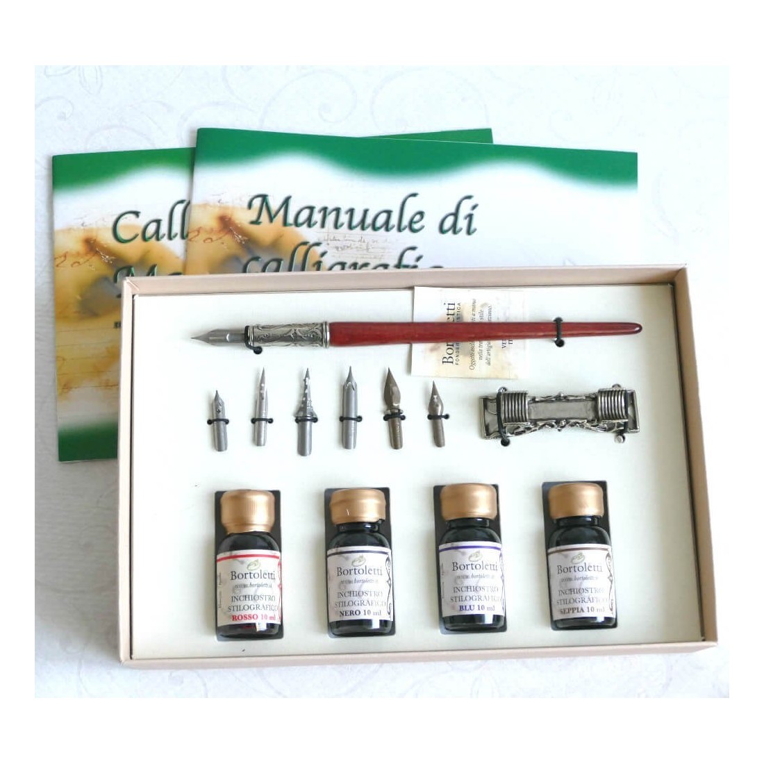 Stort värde och förfining. Set består av trä penna, brons penna supporter, fyra flaskor av bläck och sex antika spetsar.